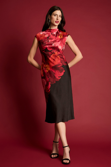 Bold and beautiful for fall, this gorgeous dress is a lovely blend of fall colours and feminine flair! Featuring a stunning floral print and bow ne...